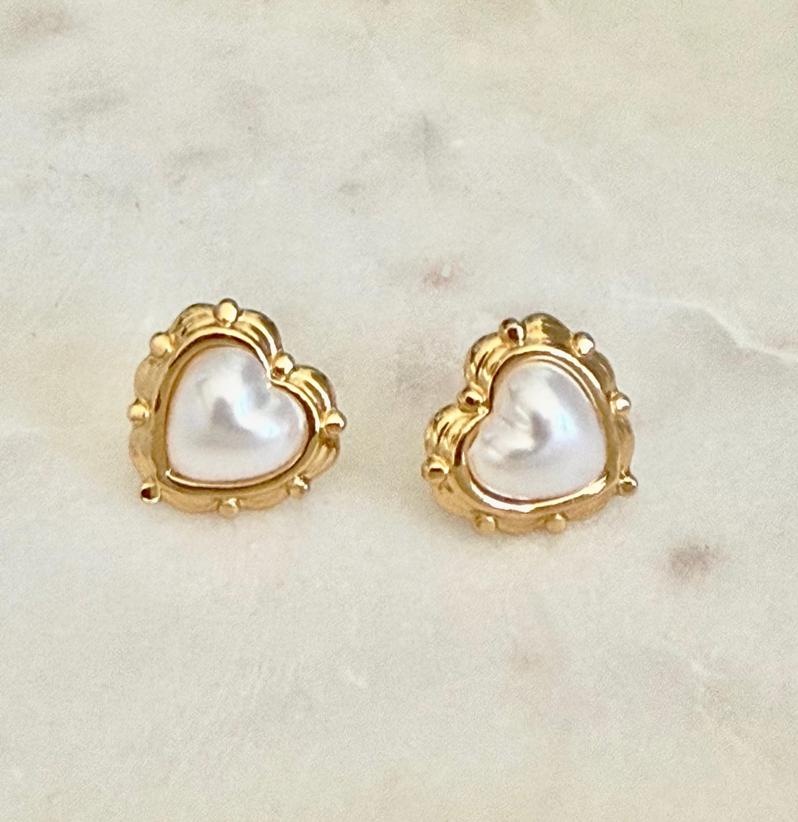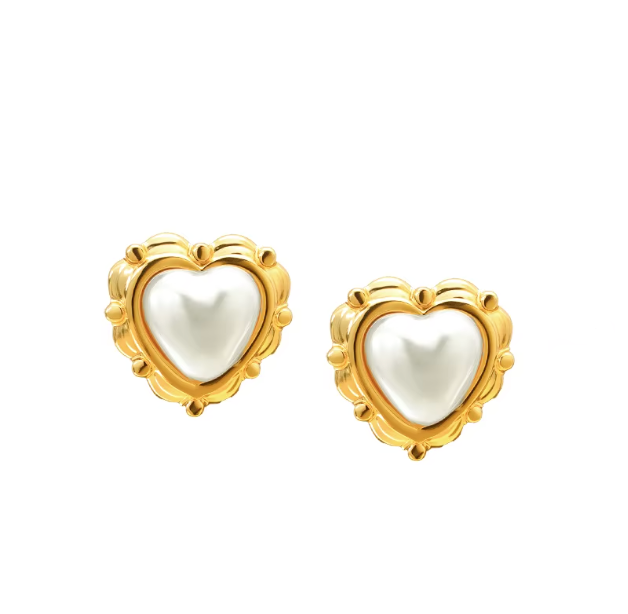 KHAI Pearl Heart Earrings touch feature luminous heart-shaped pearls framed in a gold trim adding of romance and timeless charm to your look