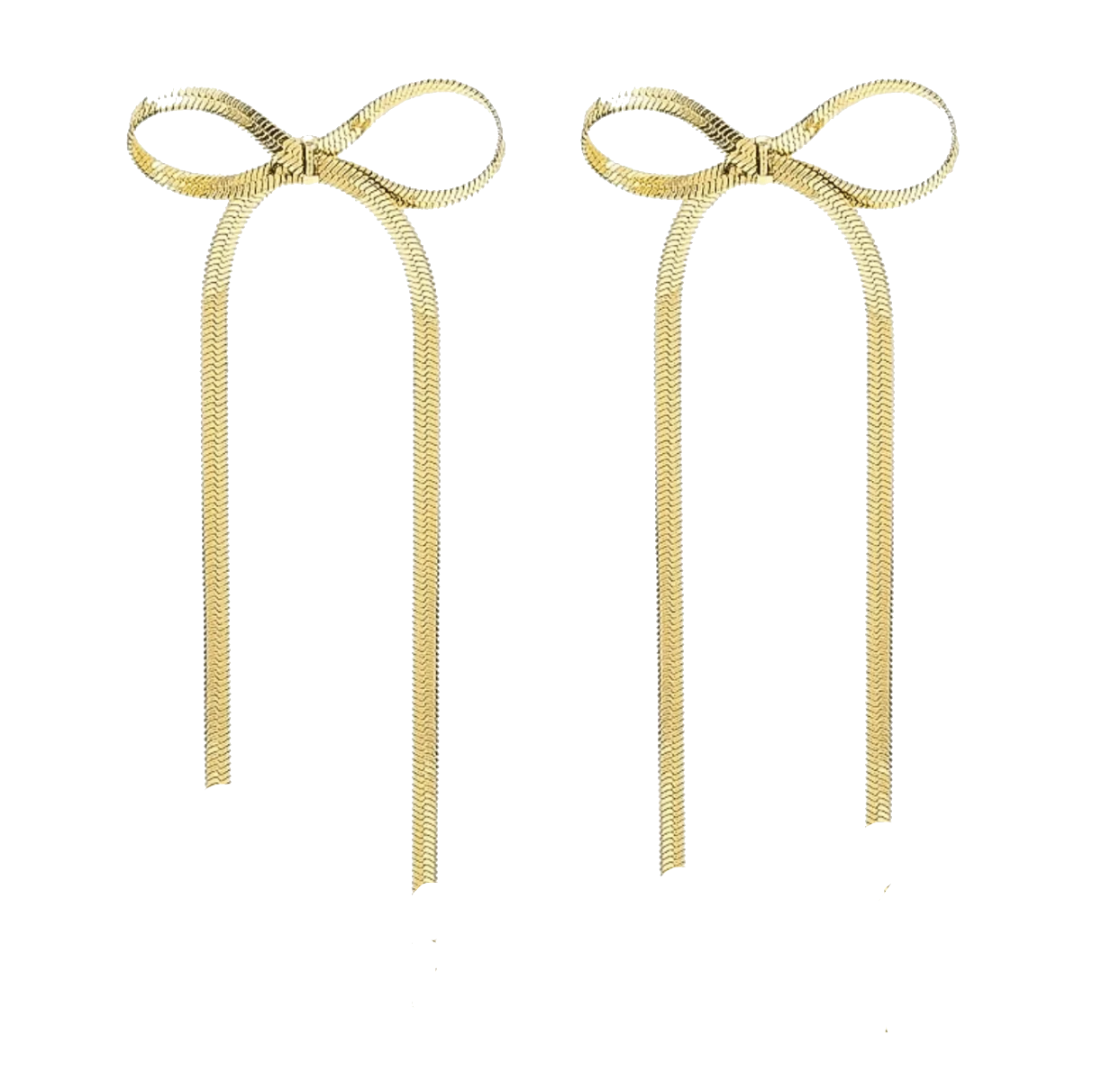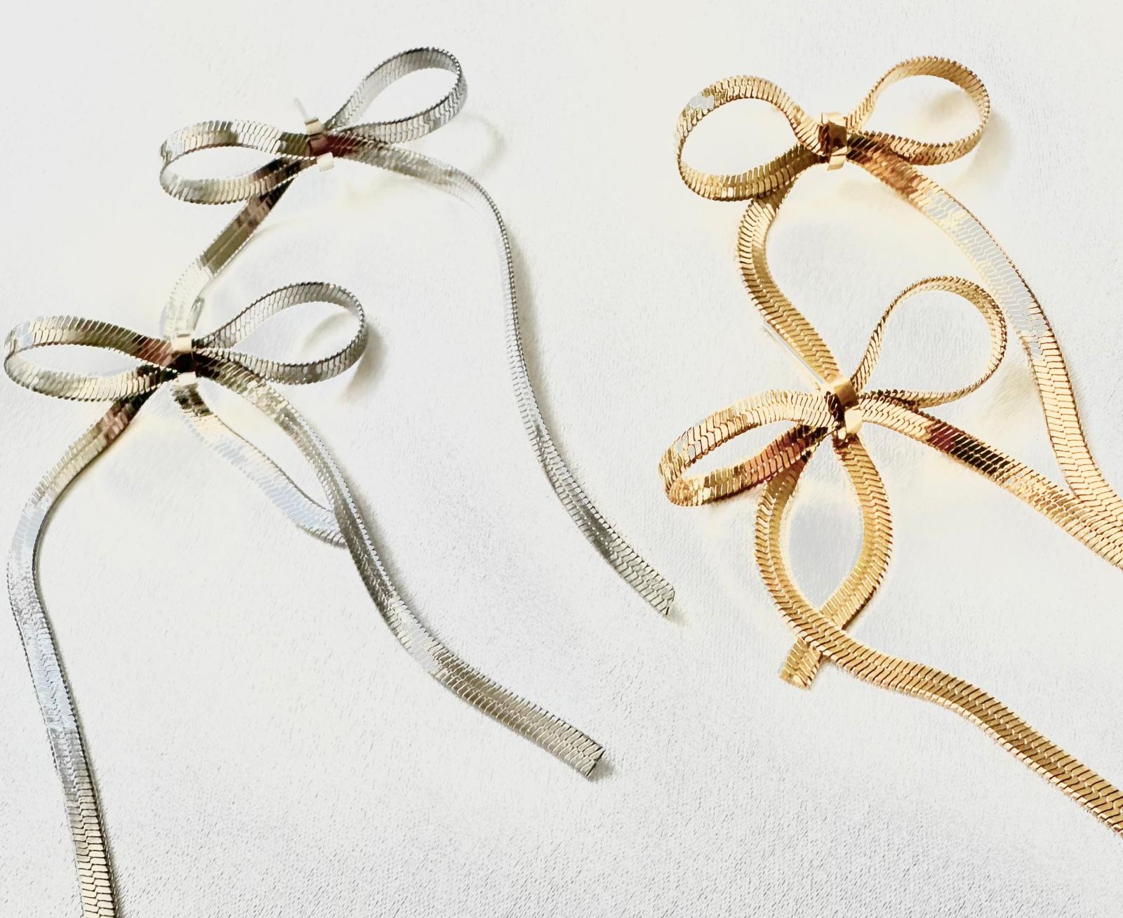 AHSA Bow Snake Chain Earrings shimmer and shine with a featherweight feel and are a perfect statement piece for your festive occasion. Available in Gold and Silver.