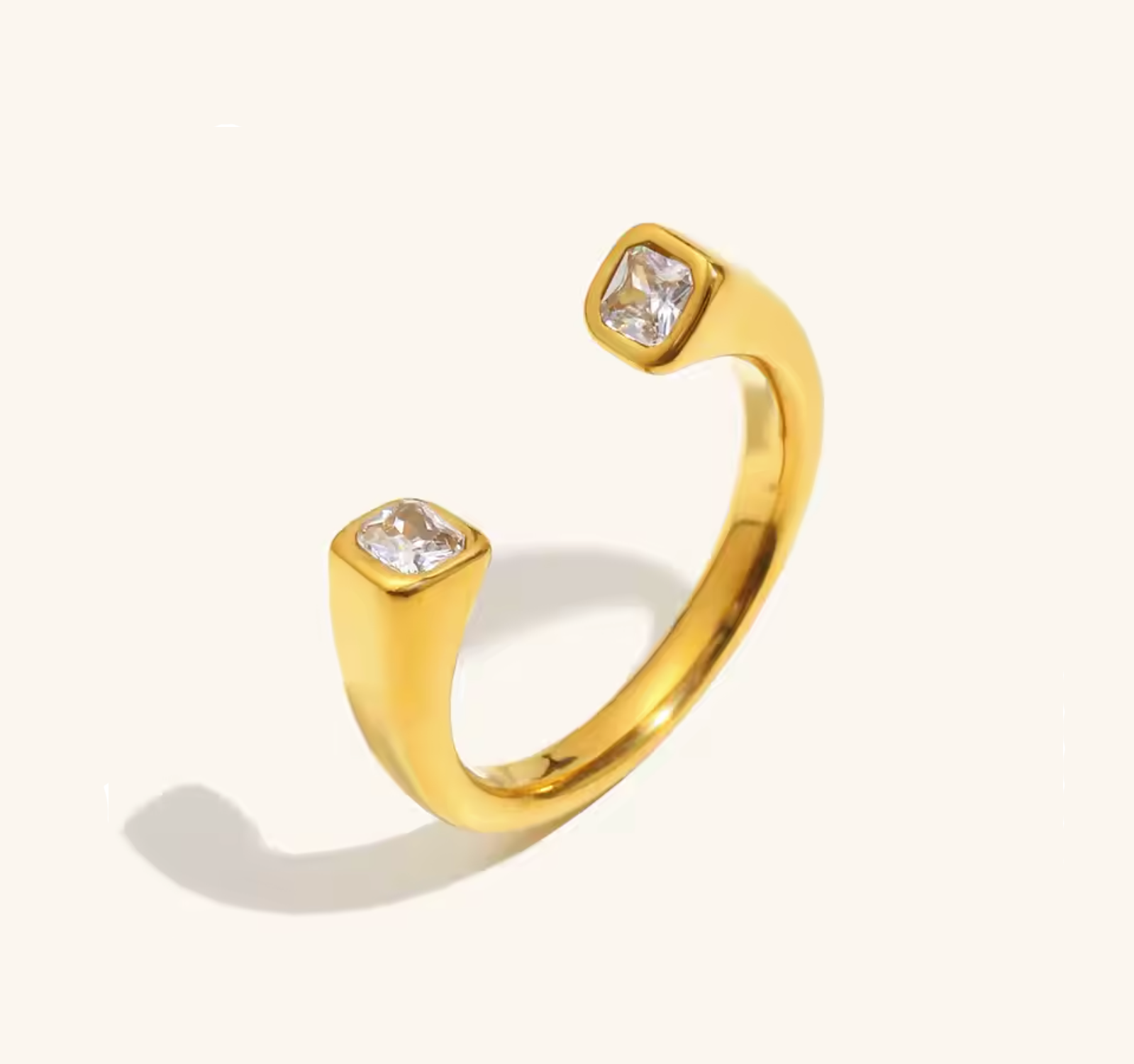 TIFF Ring features an open gold band with two square-cut zircon stones at each end for a minimalistic chic design. One size.