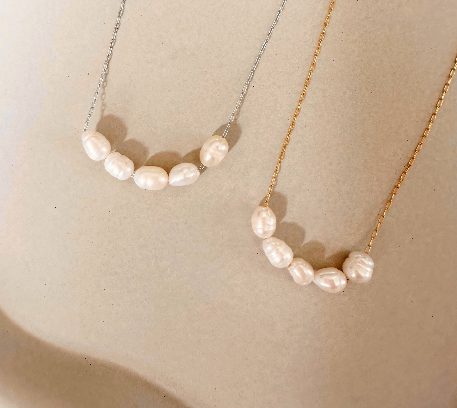 Five freshwater pearls strung on a dainty chain embodying grace, purity and timeless beauty. Each pearl is one-of-a-kind, with a slightly irregular shape. Available in gold and silver.