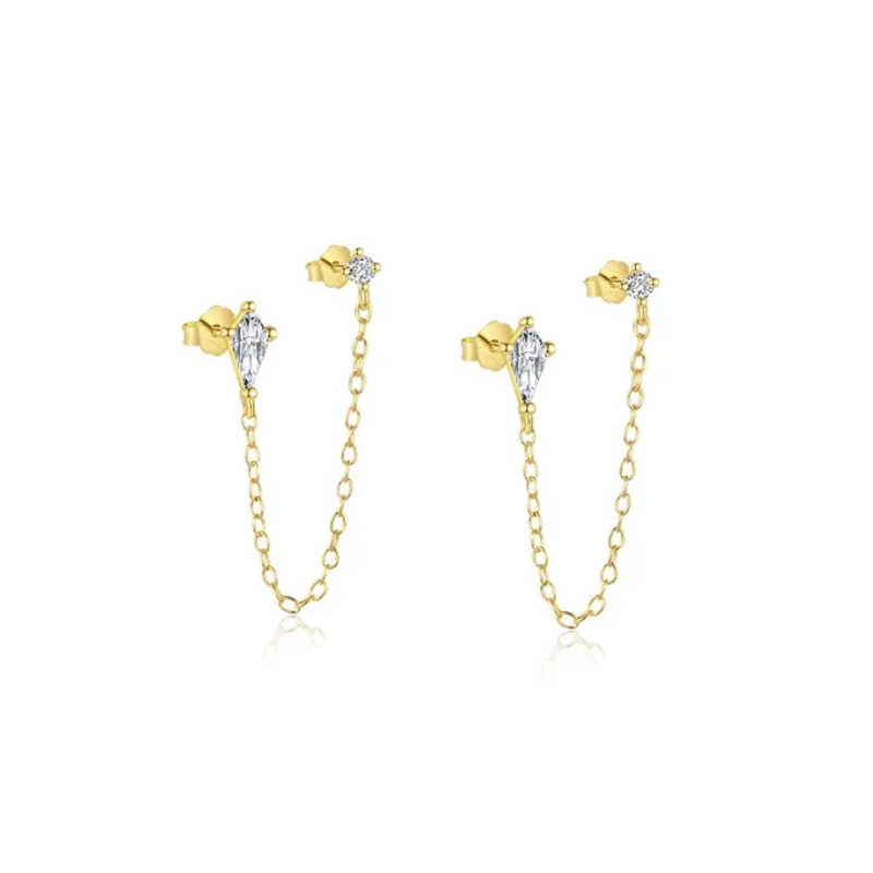 Designed for double piercings, RENE features a sparkling marquise and petite round brilliant stud, linked by a delicate gold drop chain. Modern, edgy, and effortlessly elegant.